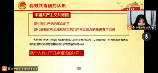 本次团课内容共分为4个部分。李老师首先介绍了团的基础知识并且引出成为优秀的共青团员应当有坚定的共产主义理想和信念、优秀的品质和道德、品学兼优的素质和扎实的文化基础以及要成为学校学生中的表率和楷模。随后,主讲人通过党的二十大精神和两个确立让同学们明白被赋予的共青团新时代光荣使命。最后,主讲人通过5个意识告诉同学们如何做一个合格的共青团员,同时又结合时代背景,引导同学们树立新思想、牢记新使命,成为堪当民族复兴大任的新时代青年。活动全程,同学们认真聆听、积极互动,活动氛围融洽。